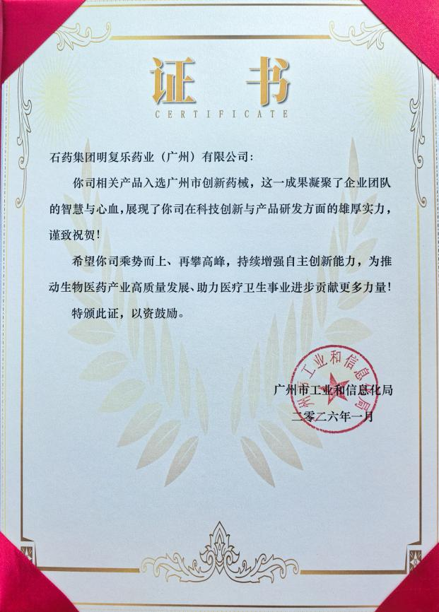 實力登榜!石藥集團明復(fù)樂榮獲“廣州市創(chuàng)新藥械”稱號