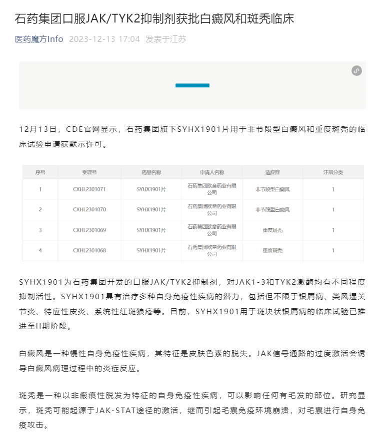 石藥集團口服JAK/TYK2抑制劑獲批白癜風(fēng)和斑禿臨床